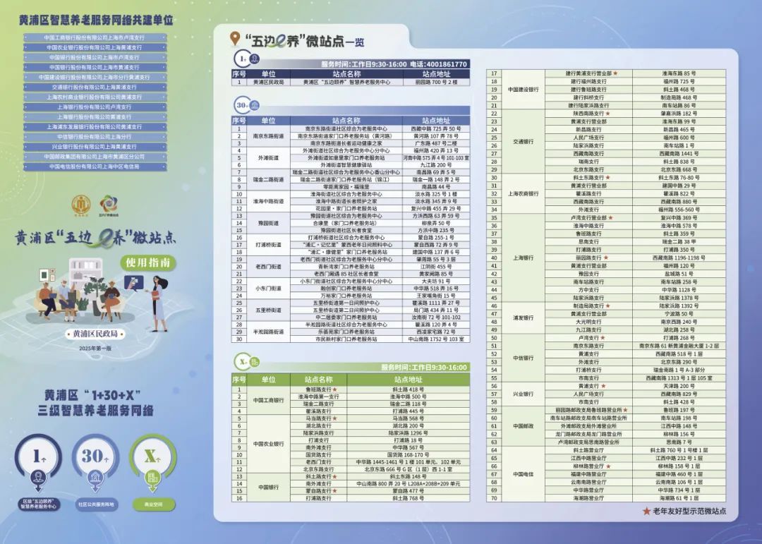 黄浦区民政局以“数字反哺、全民参与”为导向,聚焦“阵地打造、场景融合、生态协同”三大维度,依托政企协作机制,引导企业、社会机构共建智慧养老合作生态。通过“存量嵌入+增量补足”的方式,联合银行邮政网点、运营商营业厅等商业空间,以1个区级智慧养老服务中心为枢纽,30个社区公共服务阵地为基础,X个商业运营空间为补充,打造百个“五边e养”微站点,构建“1+30+X”三级智慧养老服务网络。