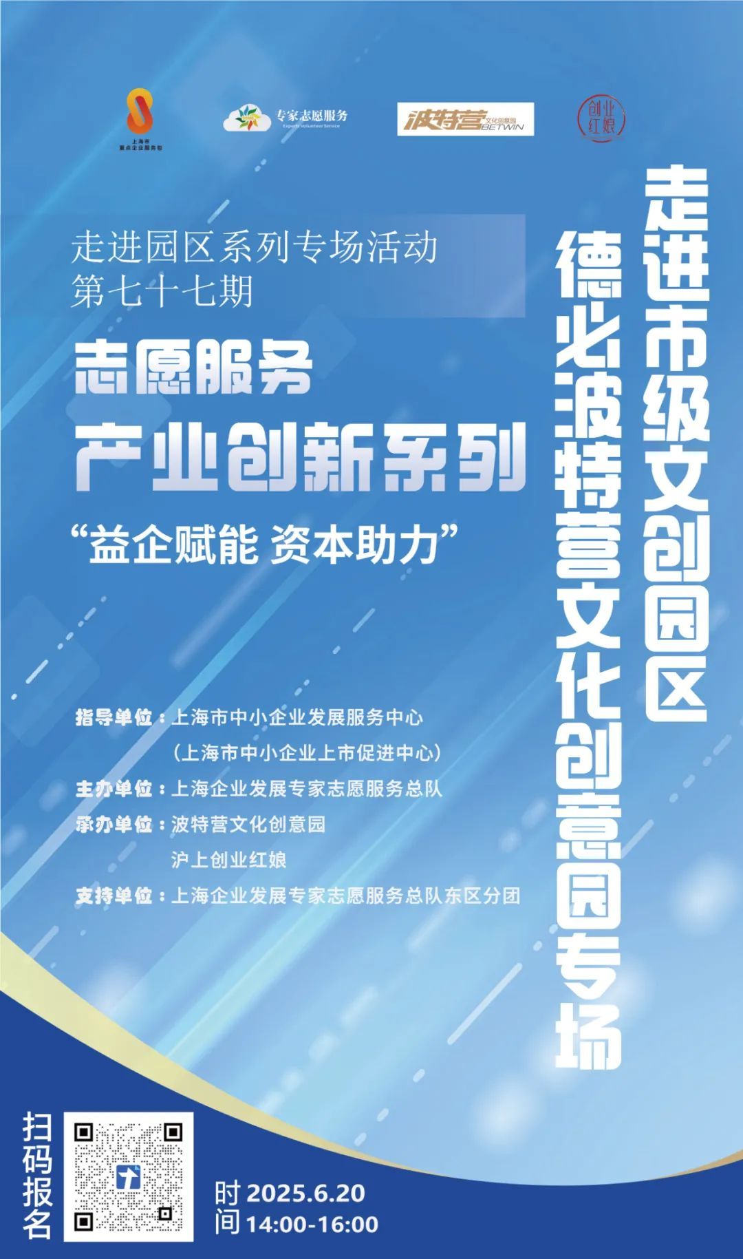 为进一步落实《上海市坚持对标改革持续打造国际一流营商环境行动方案》的文件要求,推动市、区两级企业服务资源向园区赋能,在上海市中小企业发展服务中心的指导下,上海企业发展专家志愿服务总队广泛携手各方引聚志愿专家、社会服务资源,举办“产业创新”系列活动。每月两期,一期走进特色产业园区举办投融资路演,一期携同专家、企业等走进特色园区交流,欢迎积极报名!
