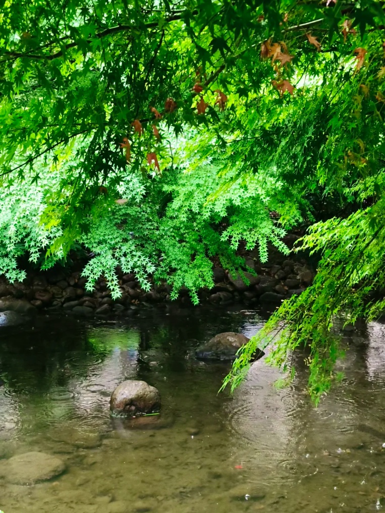 碧绿的树叶与水中的倒影相互交织,如诗如画