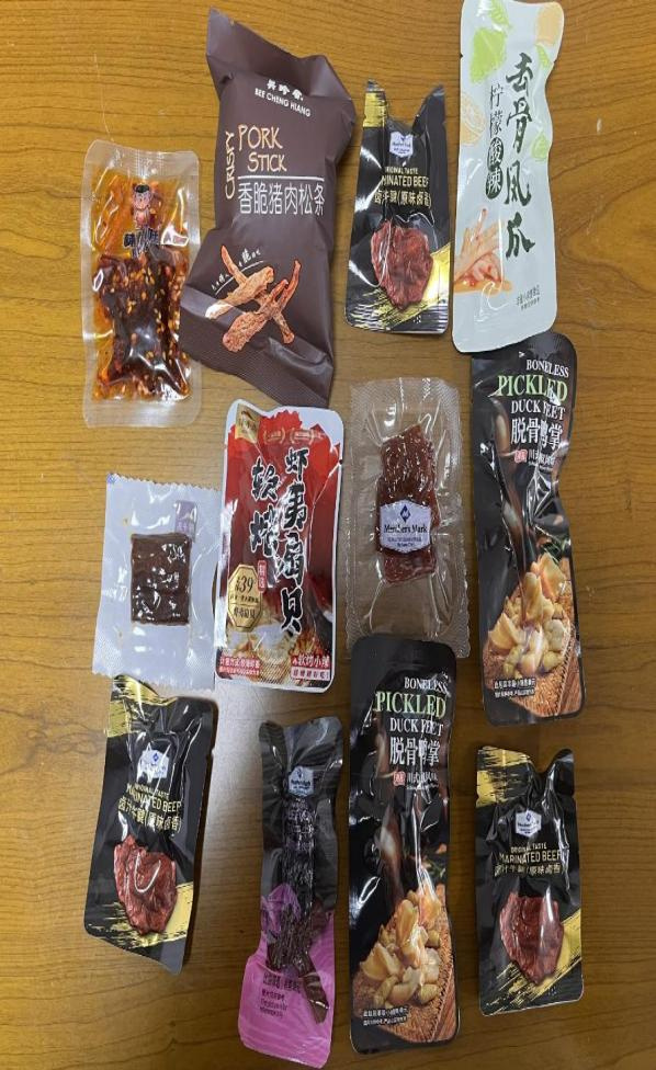 体验调查中,体验员花费129.9元在对对碰直播间下单“山姆会员店肉肉零食对对碰”,收到了26小袋拆包分装的零食,有去骨凤爪、猪肉松条、风干牛肉、脱骨鸭掌等,全都装在一个透明塑料袋中。其中,去骨凤爪、风干牛肉、卤汁牛腱的包装上均无生产厂家、生产日期等标识信息,甚至还标注了“非最小销售单元”。