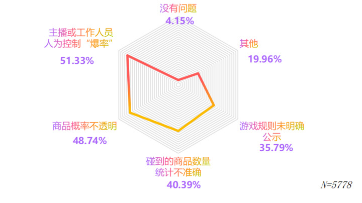 线上问卷显示,当被问及“对对碰”直播间可能存在哪些不公平或不透明的情况时,有超过一半(51.33%)的受访者认为主播或工作人员人为控制“爆率”,48.74%的受访者认为商品概率不透明,40.39%的受访者认为存在碰到的商品数量统计不准确问题,35.79%的受访者认为游戏规则未明确公示。