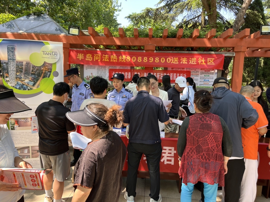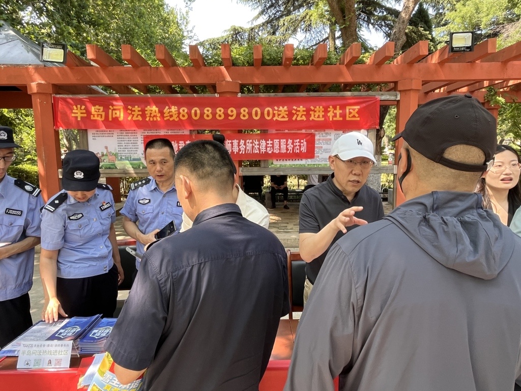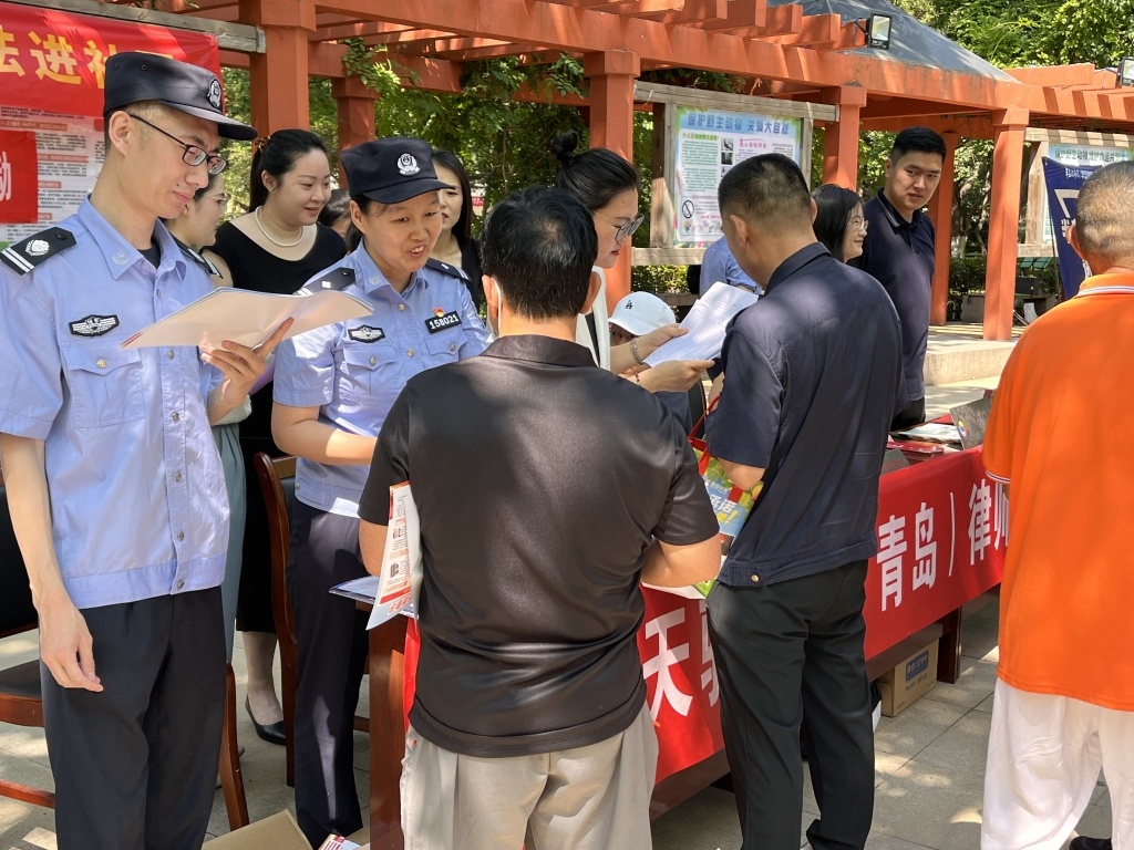 面对法律问题毫无头绪,想要维护自身权益却不知该通过何种程序实现……为了增强居民的法律意识、提升全社会反诈能力,6月17日上午9点30分,“半岛问法热线”联合市北公安分局阜新路派出所、北京天驰君泰(青岛)律师事务所资产处置专业委员会和青岛市市级公园管理服务中心,深入青岛市市北区阜新路街道海泊桥社区,在海泊河公园法治广场掀起一场“家门口的法治盛宴”,为市民带来了公益法律咨询和反诈科普双重法治大餐。