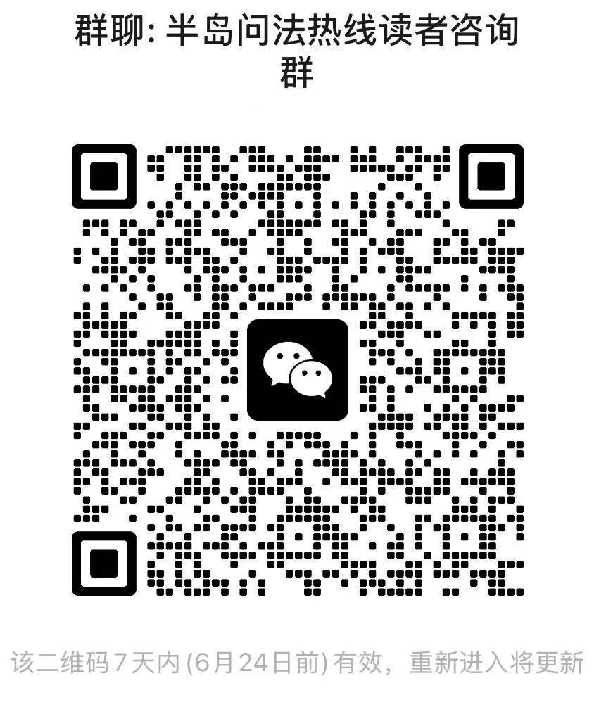 为打造百姓身边的普法品牌,半岛问法热线已经开通读者群(附二维码),有需要的市民可以扫码入群,我们会根据市民需求开启相应话题,也将联系专门律师定期解答市民关注的法律问题。