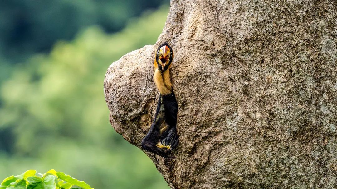 由于幼鸟还没有长距离飞行的能力,在它出巢后的一段时间内,它们一家三口将在巢洞附近的密林中生活,直到犀鸟宝宝练就能在雨林翱翔的本领。
