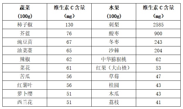 维生素C主要来源为新鲜蔬菜和水果,一般是叶菜类含量比根茎类多,酸味水果比无酸味水果含量多。