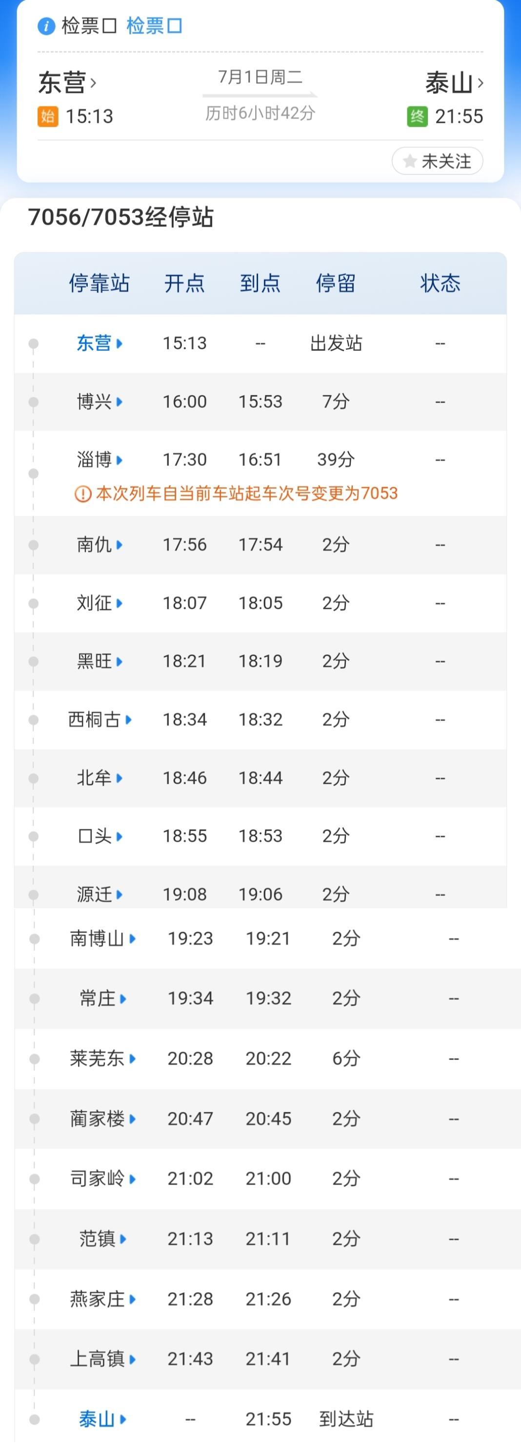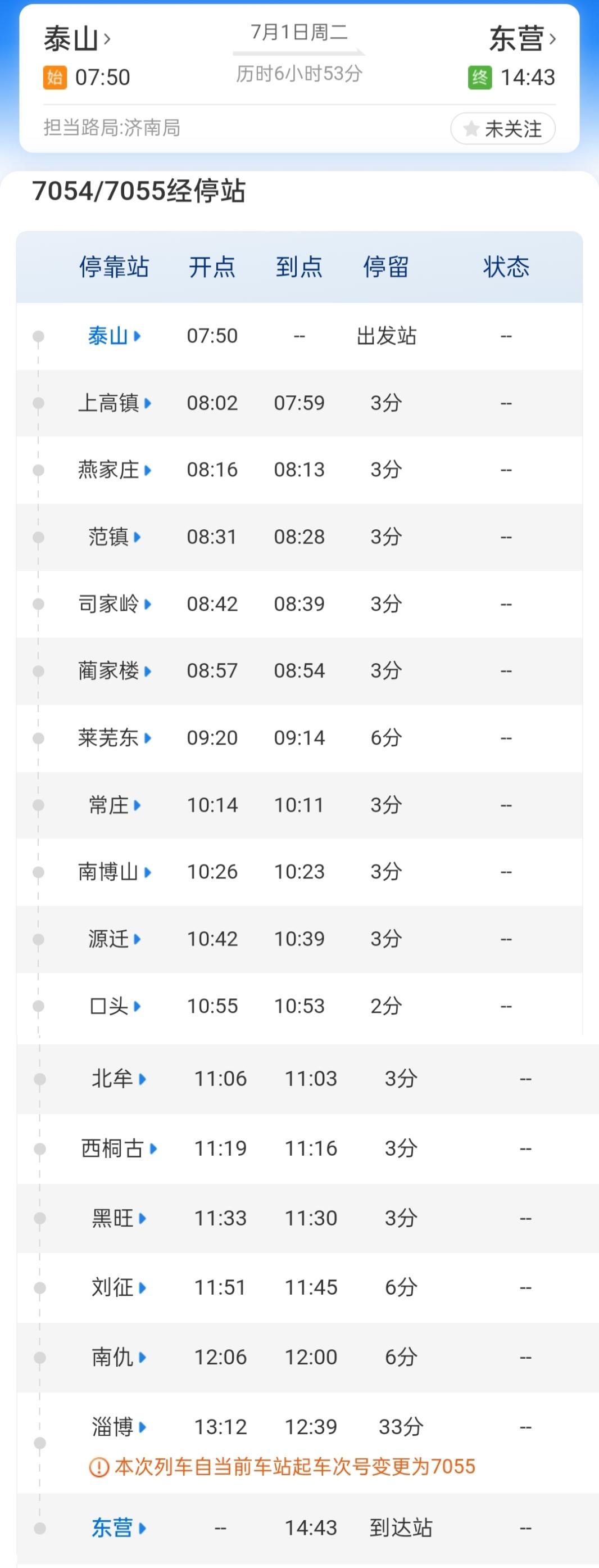 其中,泰山至东营的7054/5次列车,每日早晨7点50分从泰山站始发,全程运行6小时53分,于下午2点43分终到东营站。东营至泰山的7056/3次列车,每日下午3点13分从东营站始发,全程运行6小时42分,于当晚9点55分抵达泰山站。