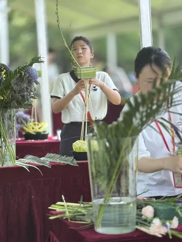 比赛中,选手们以百子莲、大花葱、尤加利、文心兰等花材为“画笔”,在花器中勾勒自然意境:有的以藤蔓缠绕隐喻生态循环,有的用明快色调展现都市生活活力,以紫色花材点缀绿色基底,呼应“党建引领生态发展”的主题。
