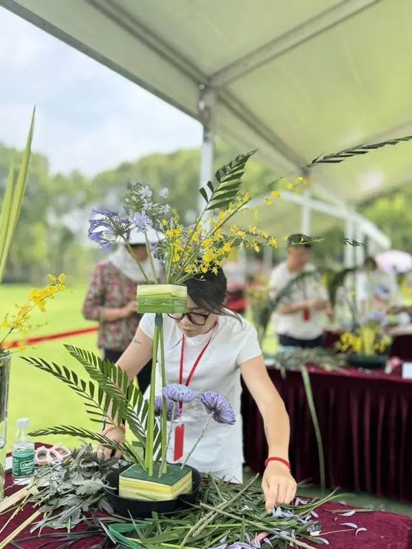 活动现场,海派插花名家带来精彩演示,以灵动的枝叶搭配与色彩碰撞,诠释“师法自然、融情于艺”的海派插花精髓,让近50位参赛选手与观赛市民近距离感受传统花艺的现代魅力。