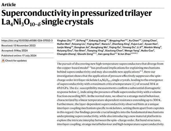 2024年,赵俊团队和合作者发现了三层镍氧化物高温超导体,并揭示了其独特的层间耦合和奇异金属行为,为研究高温超导提供了新的视角和平台,相关研究成果发表于权威期刊《自然》,引发了国际学术界的广泛关注。《自然》和英国物理学会《物理世界》等专业学术期刊对其研究成果进行专题报道和评论,称这一发现“进一步拓宽了超导探索的领域”。