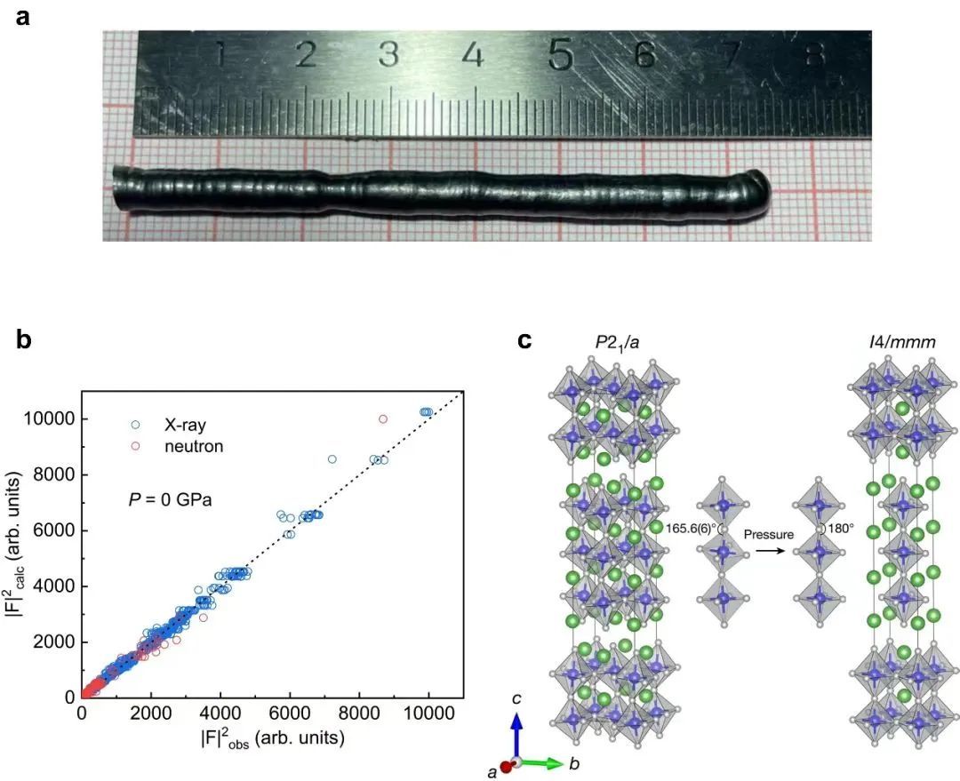(a)La4Ni3O10-δ单晶样品照片;(b)中子和X-ray 单晶衍射数据;(c)压力下晶格结构的演变