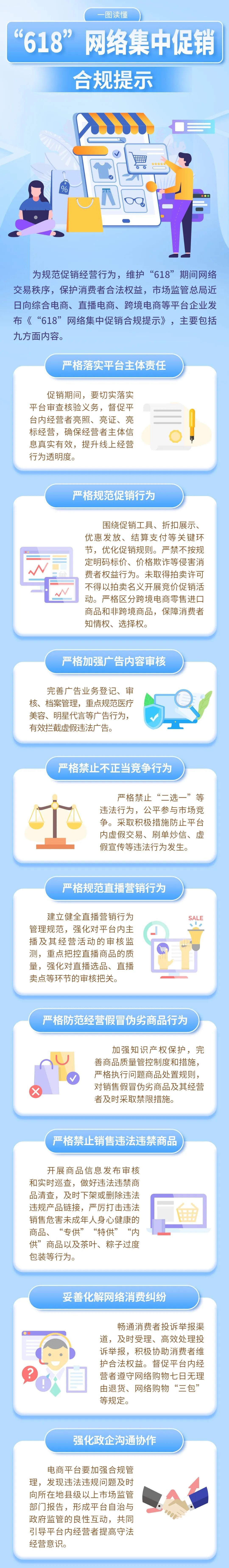 市市场监管局介绍,为规范促销经营行为、维护“618”期间网络交易秩序、保护消费者合法权益,市场监管总局近日向综合电商、直播电商、跨境电商等平台企业发布《“618”网络集中促销合规提示》,主要包括严格落实平台主体责任、严格规范促销行为等9方面内容。详见↓
