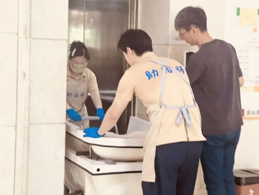 上海宝山区逸仙养老院助理院长告诉记者:“这些接受助浴服务的老人基本是躺着,助浴服务将他们从床上直接抬到了浴缸里。而我们机构是采取床上擦浴的形式,无法做到像第三方专业助浴服务那样,用浴缸进行全身浸泡沐浴的方式。黄梅天到了,进行一个全身心的沐浴,让老人能够过一个比较舒服的夏天。”