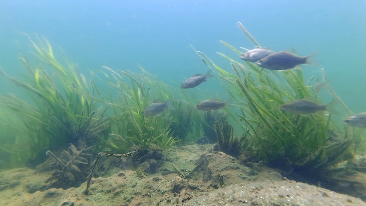 为恢复和增强河道的生态自净功能,构建了“螺-草-鱼”复合生态系统,通过种植水草抑制河底藻类生长及浮泥产生,通过螺蚌吞食水中浮泥及其他悬浮物实现对水体的生态清理。鱼类对水草及其他水生动物的捕食机制,维持了水生态系统的平衡稳定,持续保障蟠龙水域水质及水体清澈度。