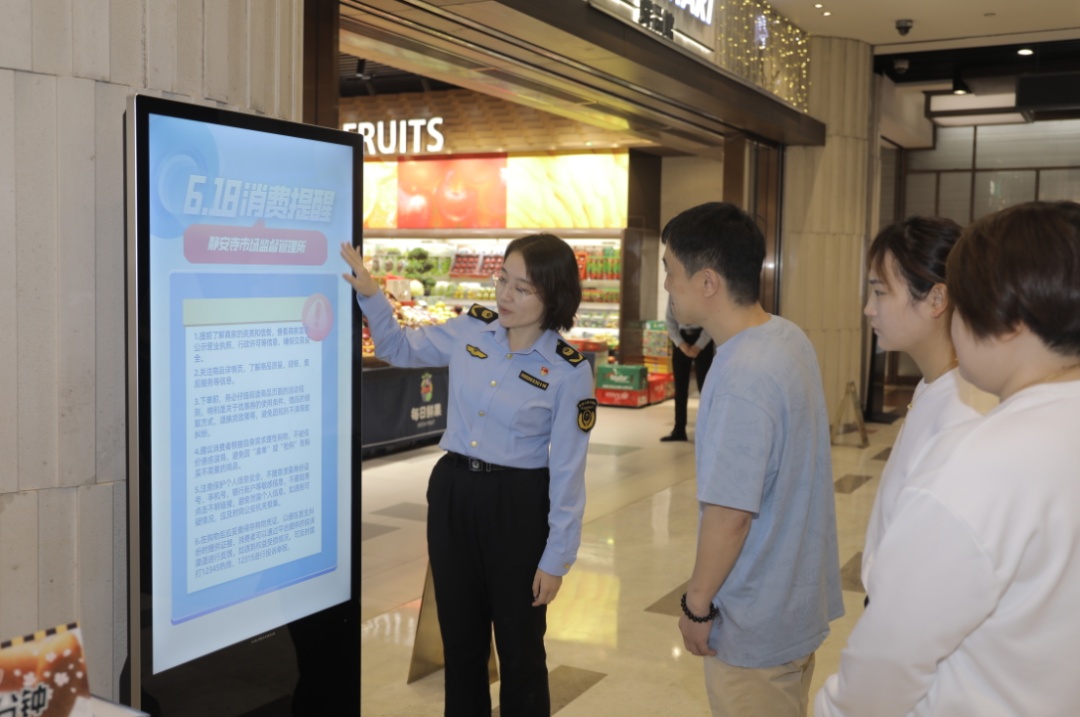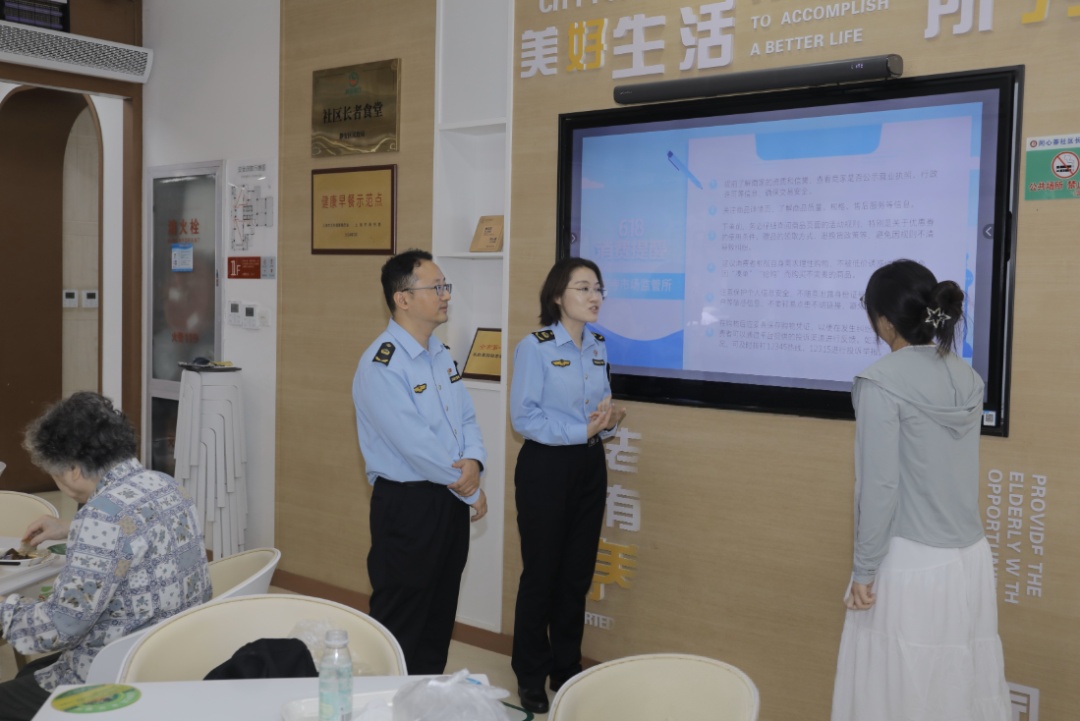 覆盖社区居民:静安寺市场监管所依托综合网格服务站宣传《“6·18”消费提醒》,提醒居民防范低价诱惑、理性消费。