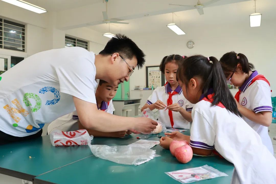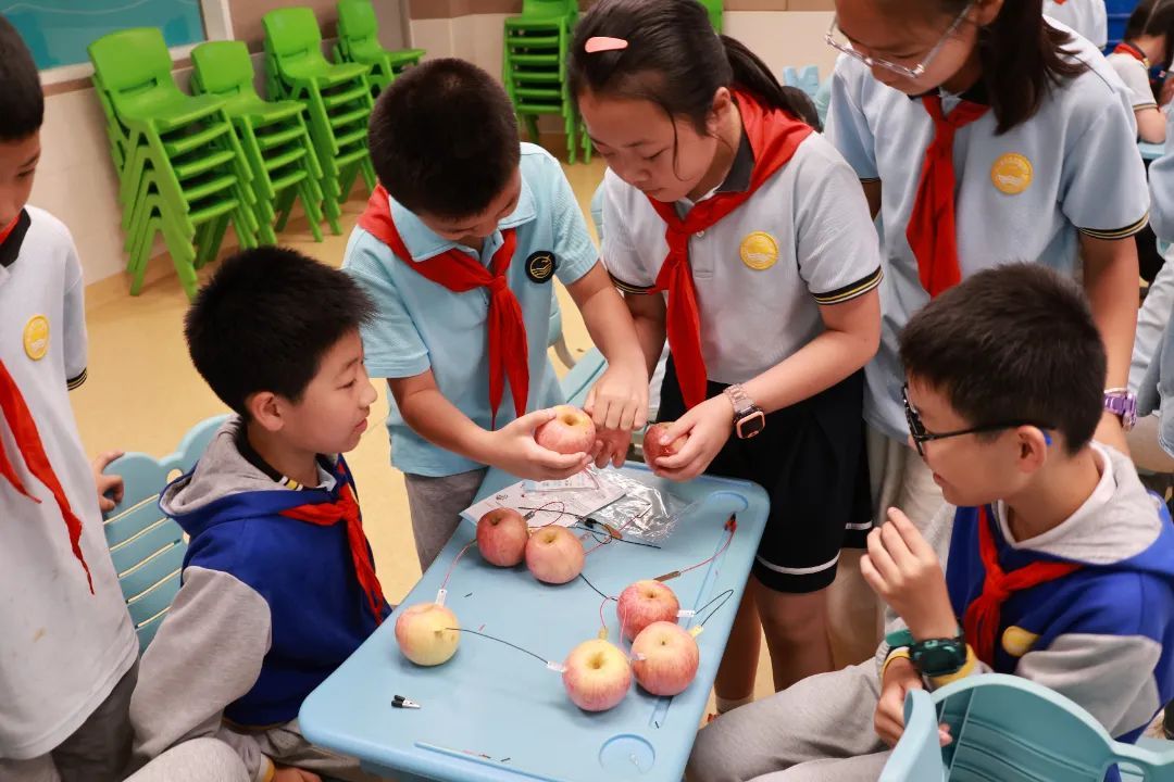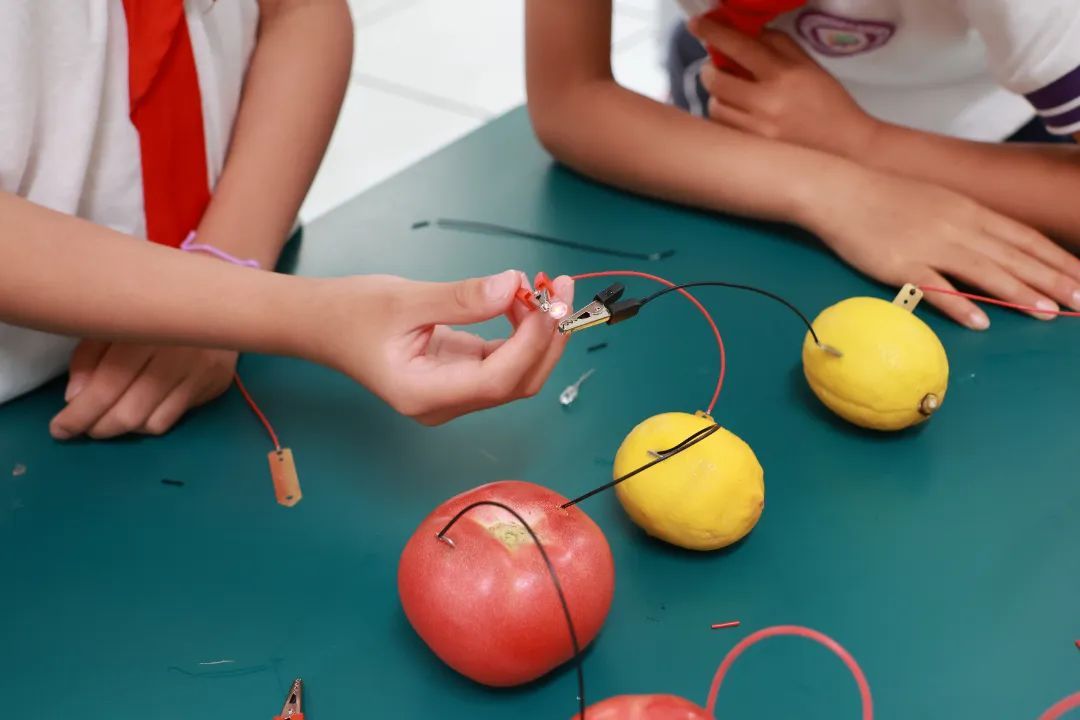 为加强学生对能量转化的理解,现场特别设置水果发电实验环节。当导线连接苹果与LED灯形成闭合电路,学生们惊喜地喊道:“亮啦!亮啦!”科普工程师适时抛出问题:“怎么样能让灯更亮呢?”讨论声顿时从教室各处响起:“六个苹果连在一起的话会不会更亮呢?”“接入柠檬会不会比苹果更亮?”“快把你们组的水果也拿来!”随着更多的水果相继接入,LED灯光逐渐增强,实验成功的惊叹和掌声此起彼伏,科学探究的热情点燃整个课堂。