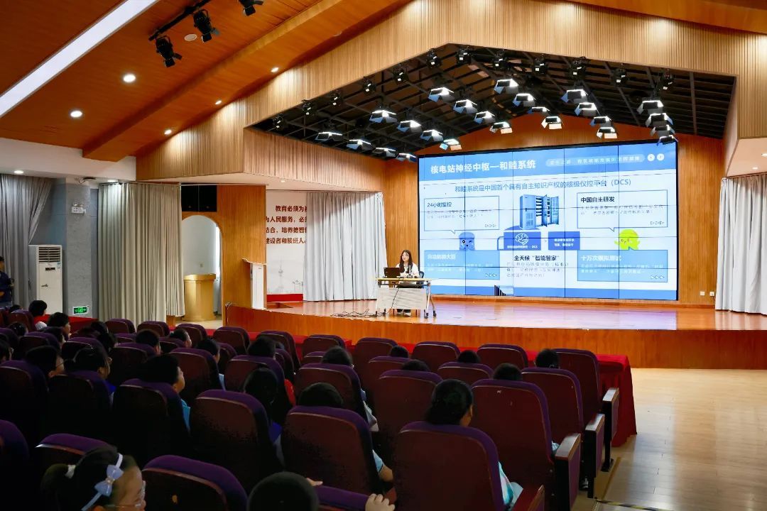 活动伊始,中广核数科的工程师带来干货满满的科普小课堂,带领学生们了解双碳目标和减少碳排放的必要性,深入浅出地讲解了核能发电的原理、核能发展历程、核电的安全性。学生们不仅认识了我国自主三代核电技术“华龙一号”,还了解到守护核电站安全的“神经中枢”和睦系统。在问答环节中,现场争先抢答,气氛热烈。