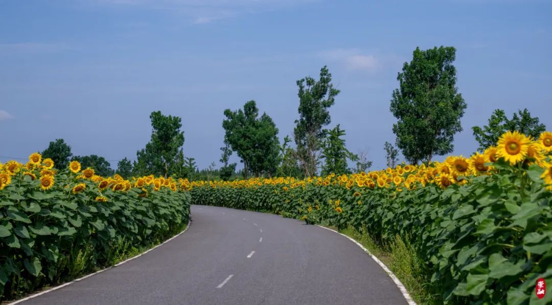 沿着光明田原景区内蜿蜒的道路前行,很快便会进入一条“向日葵步道”。道路两侧均匀布满了向日葵,其植株笔直挺立,大朵的金色花盘随风摇曳,仿佛在向路人绽放笑颜。高空俯瞰,满目皆是金色浪潮,热烈而壮美。游客们穿梭其中,仿佛置身于童话世界。