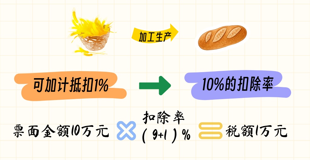 例如,上述食品加工厂将购进的小麦用于生产面包(适用税率13%),取得增值税专用发票,票面金额10万元,税率9%,在购入当期企业可抵扣进项税额为0.9万元,在生产领用当期,再加计抵扣0.1万元。
