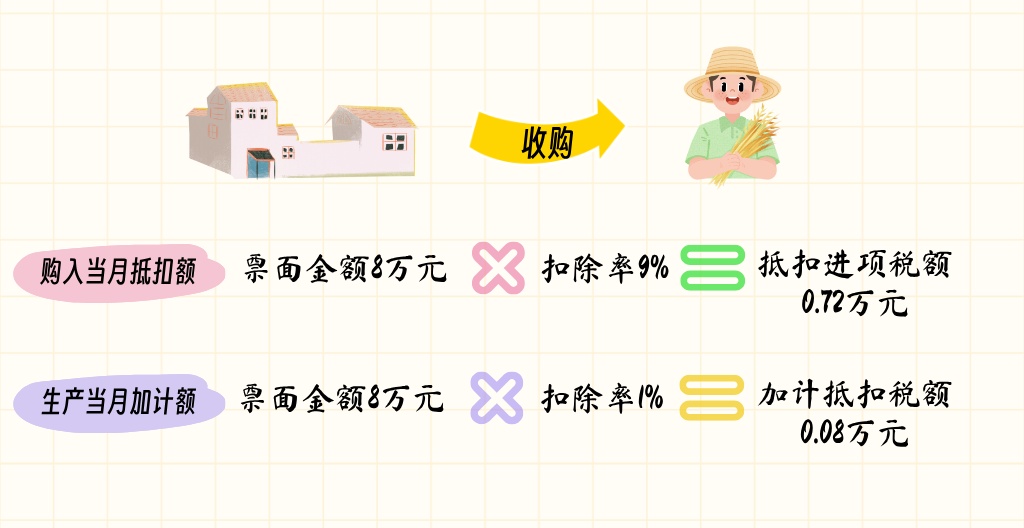 例如,某糕点厂从农民手中收购一批糯米,开具的农产品收购发票上注明买价8万元,在购入当月,企业可抵扣进项税额0.72万元,在生产领用当期,再加计抵扣0.08万元。