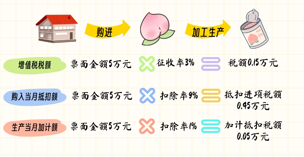 比如,某饮料厂从小规模纳税人处购进水果用于生产水果罐头(适用税率13%),取得增值税专用发票,票面金额5万元,征收率3%,税额0.15 万元,在购入当月,企业可抵扣进项税额0.45万元,在生产领用当月,再加计抵扣0.05万元。