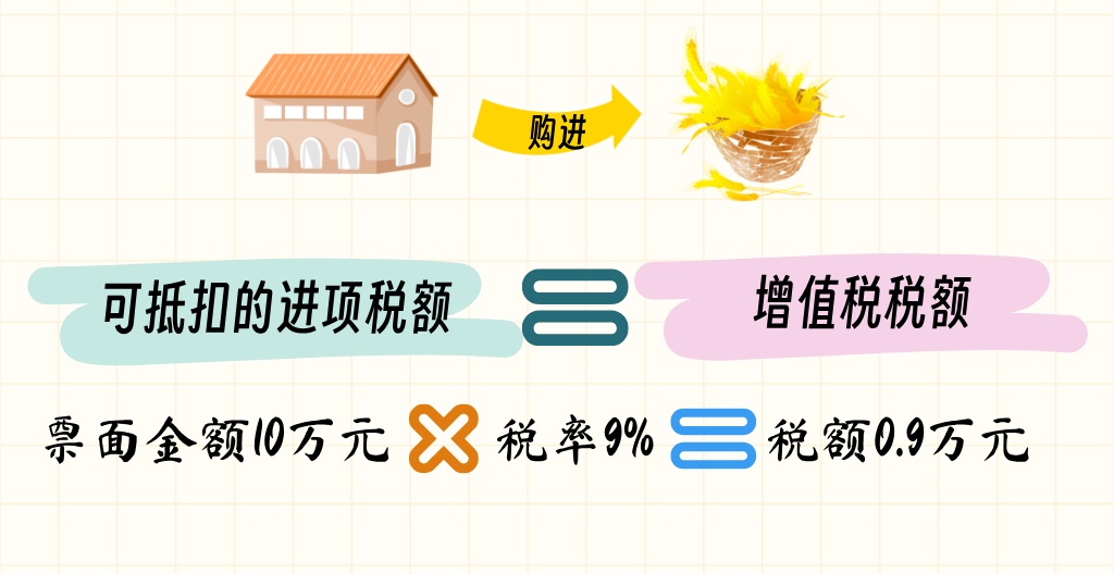 例如,某食品加工厂从一般纳税人处购进小麦用于生产面粉(适用税率9%),取得增值税专用发票,票面金额10万元,税率9%,增值税税额0.9万元,那么该企业可抵扣的进项税额就是0.9万元。