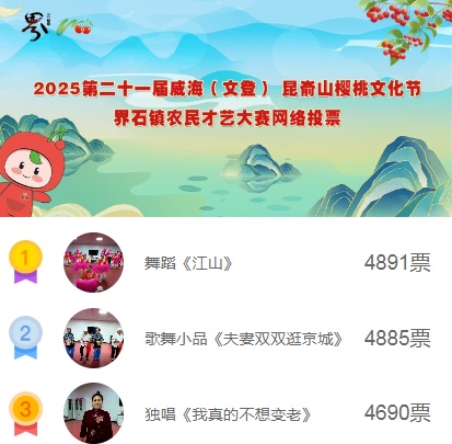 日前,2025第二十一届威海(文登)昆嵛山樱桃文化节的重头戏——农民才艺大赛在界石镇楚岘广场主会场激情开赛!19组来自全镇各村的“草根明星”齐聚舞台,用歌舞、小品、快板、器乐独奏等丰富多彩的节目,展现了新时代农民昂扬向上的精神风貌,为乡村文化振兴注入蓬勃活力。