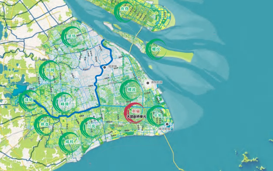 大团赵桥单元,恰好坐落于浦东最南端的三条灶港与浦东运河的交汇处,紧邻大团北大街历史文化风貌区,自然乡村风貌和历史文化底蕴紧密结合。这里的水系梳状展开形似羽扇,成为上海乡村风貌空间结构中“羽扇”意象的典型代表。