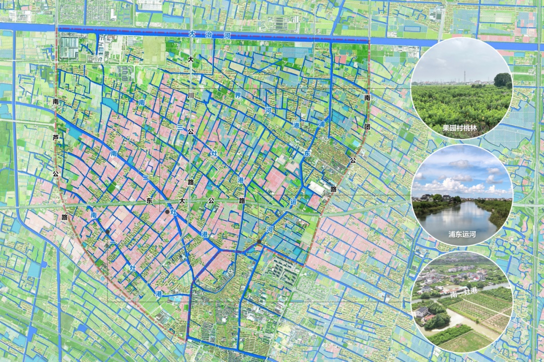 大团赵桥单元内水资源丰富,东部浦东运河穿流,北部大治河横贯,一灶港、二灶港、三灶港等古河道形成弧形序列,并延伸出上百条均质支流。漫步于此,梳状的灶港与鱼骨状的纵塘交织,孕育出条状的圩田、簇状的村居,满眼的林田绿意,散发着浓郁的自然乡味。