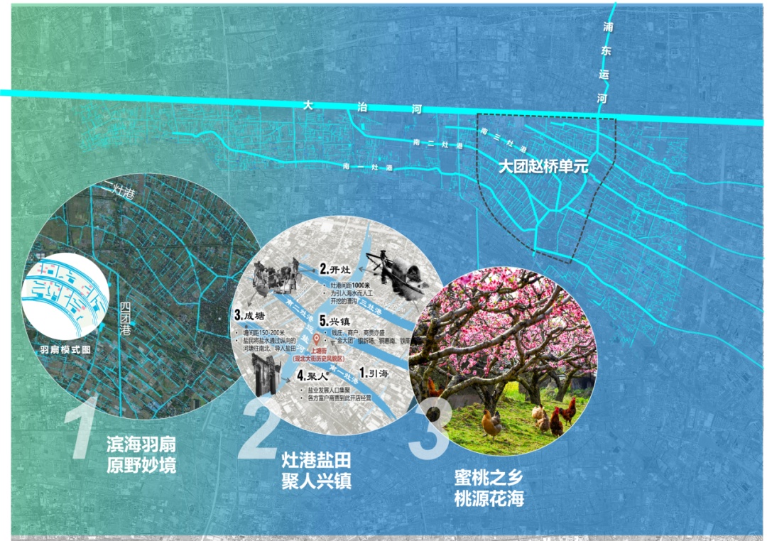 大团赵桥单元地处浦东南端水脉交汇之处,依傍历史文化风貌区,梳状水系勾勒出“羽扇”般的乡村风貌,桃香与古韵交织。值第35个全国土地日之际,以水为链、以桃为媒,千年“金大团”的厚重与百年盐灶港的岁月在大团赵桥单元16平方公里的土地,正上演圩田智慧与现代规划的交融,邀您共赏“沪派江南”文化新篇。