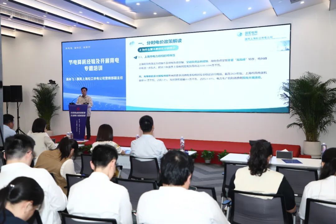 活动下半场,聚焦企业实际需求,举办了用电专题培训。区经委解读了绿色工厂等绿色低碳专项政策,帮助企业把握“政策红利”。国网上海松江供电公司则介绍了峰谷电价政策、绿电交易等内容,指导企业科学智慧用电。培训后还设置了互动交流环节,由区经委、供电公司专家团队现场为企业答疑解惑。