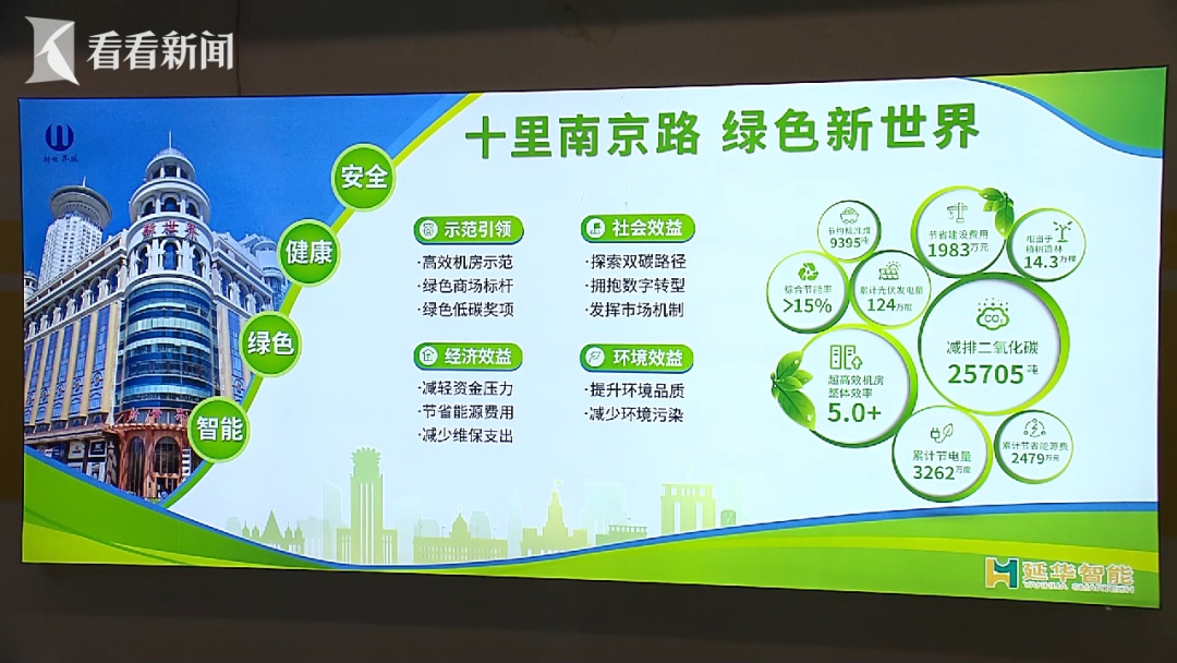 南京路步行街是上海最繁华的商业街之一,你可能想不到它还是全国建筑低碳改造项目的试验场,以多个商业建筑改造成为全国首个碳效提升示范商圈,这样一个涵盖众多商业综合体的南京路步行街,绿色低碳是怎么实现的? 连日阴雨,但南京路步行街最西端的新世界城里,还是温度适宜,灯光明亮,舒适的购物环境,让消费者们能悠闲逛街。而为整座建筑平衡这些环境体感的秘密,就藏在地下二楼的高效机房里。“这里是空调机房,绿色是冷却水,蓝色是冷冻水,橘黄颜色是我们的热水系统,”工作人员介绍说,“商场主要依靠这样一个水循环系统供冷供热。” 这套最新升级的高效冷水机组及变频循环水泵,配合上升级过的空调智能控制系统,不论外面的天气有多恶劣,商场内始终能控制在相对恒温、恒湿的舒适环境,综合能效比大于5.0,处于全国领先水平。 能效比,通常是指能源转换效率之比,能效比越大,节省的电能就越多。新世界城,作为这一轮南京路步行街商业建筑碳效提升试点的首个实践样板,在2022年,对南楼的制冷、供热、照明、数字化系统进行了整体提升改造,提升能效比、降低能耗,是设计中的重要考量。“改造后,每年能耗大约节约30%,”新世界城能源管理部负责人顾惠达算了一笔账,“折合成经济效益,差不多节约300多万人民币。” 比如照明,所有的白炽灯、荧光灯、卤素灯,全部改成了高效LED照明灯具,中庭、侧墙等区域还进行了透光设计,引自然光源作为补充。这些措施使得商场仅照明能耗就能比原先降低60%以上。顾惠达补充说:“2020年我们的年度碳排放量达到27982吨二氧化碳,改造后的2023年,已下降至15577吨。” 南京路步行街上还有多栋建筑,也已悄然进行了降碳改造。比如,上海旅游纪念品商厦,就在屋顶设置了移动式阳光房,顶部安装太阳能光伏发电板,并装备了小型储能技术。“整片膜大概200多平方,”物业方工作人员孙艺解释,“无论在阴天还是晴天,它都能通过吸收太阳能为大楼补充能耗。” 崭新亮相的世纪广场,也在前期设计照明方案时,就充分考虑了效果展示和节能低碳的双重要求。“设置了高中低三层次的灯光布局,借用周边环境光,”孙艺介绍,“用有限的能耗去实现最完美的展示效果。” 目前,南京路步行街上已完成了7个单体的绿色低碳节能改造,虽然长期来看能收获减排效应,并节省用电,降低日常开销,但这样的批量改造也需要在短时间内投入大量资金,资金从何而来呢?南京路商圈为此也进行了一些创新尝试,比如新世界城的改造,用的就是合同能源管理的模式。“由合同能源公司投资,我们每年将节约下来的能耗折算成经济效益,按比例返还。”顾惠达道出关键。 同时,项目还向银行申请了绿色信贷,同时采购了绿色保险,来提高项目的风险抵御能力和效益保障能力。后续,南京路步行街还将对包括新世界大丸百货、南京大楼等在内7个建筑实施碳效提升工程,希望能实现商圈楼宇改造后降碳率达到15%以上。上海新世界(集团)有限公司项目管理部副经理周全表示,他们仍在持续思考,如何运用好各项节能技术实现降碳目标。 黄浦区发改委主任姚恒衡表示,淮海路商圈、豫园商圈也将陆续启动绿色低碳改造项目。“改造节约了用能支出,几年内可实现成本平衡,另一方面,改造提升了消费环境舒适度,让消费者更愿意来。” 今年3月,黄浦区还成功还成功入选第二批国家碳达峰试点,成为上海唯一入选的主体。通过跟市民贴得更近的方式,让他们能够理解、认识、参与到绿色低碳中来,进一步探索商业建筑能效碳效提升路径的同时,也为南京路商圈高质量发展提供更多绿色动能。