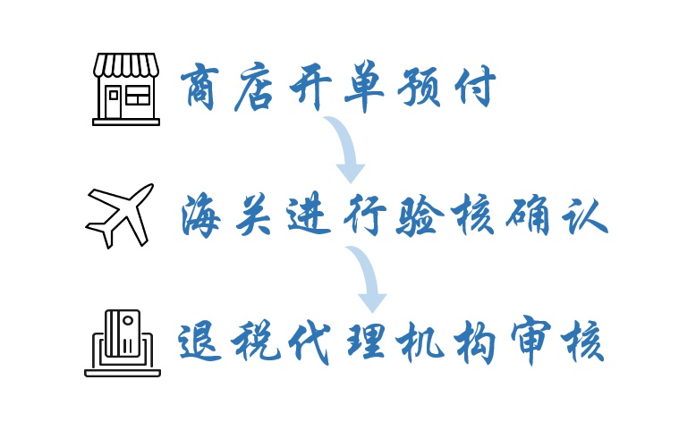 商店开单预付、海关进行验核确认、退税代理机构审核。