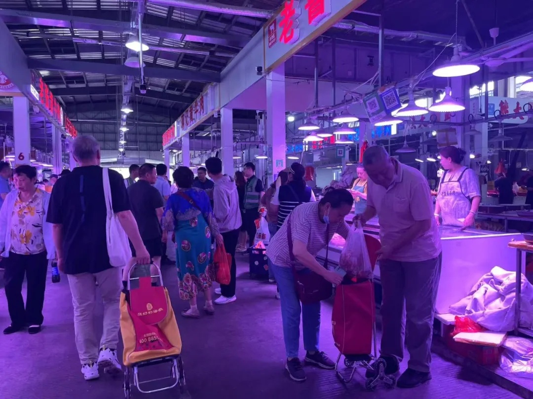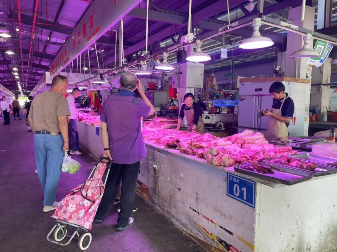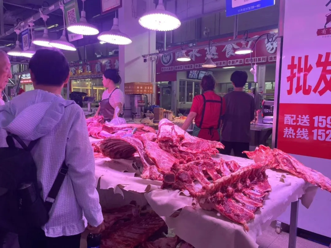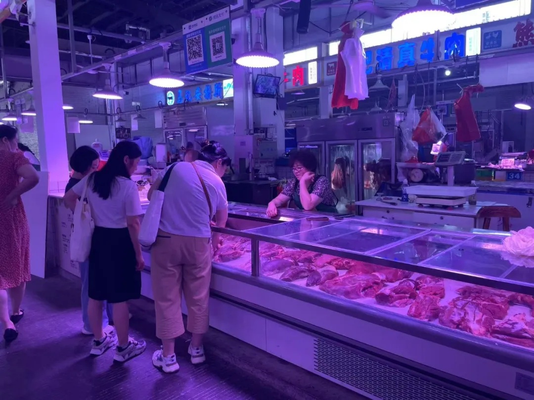 9点半左右,抵达沪蔬通农贸市场后阿姨叔叔们拉着小推车迅速奔向摊位,最受欢迎的还是各种肉制品摊位。