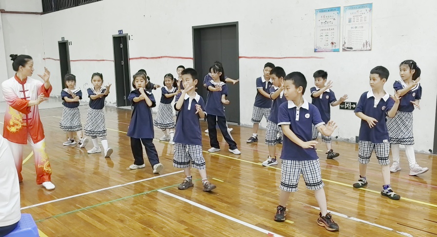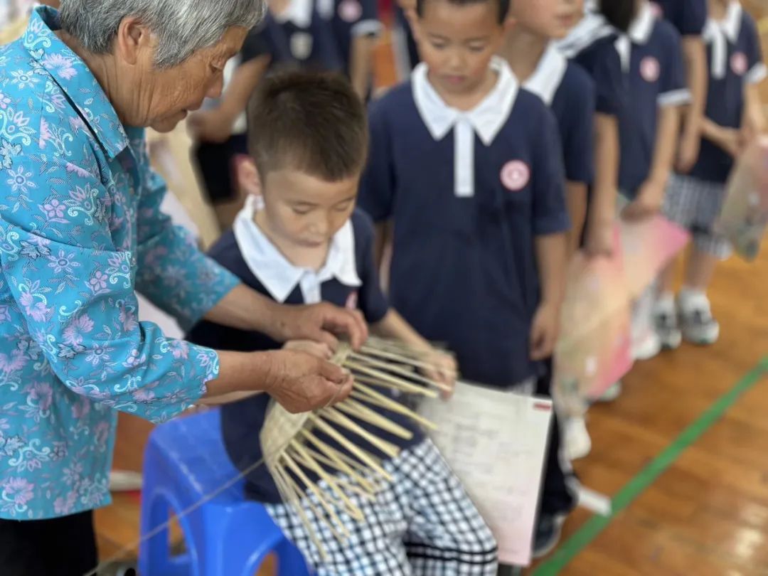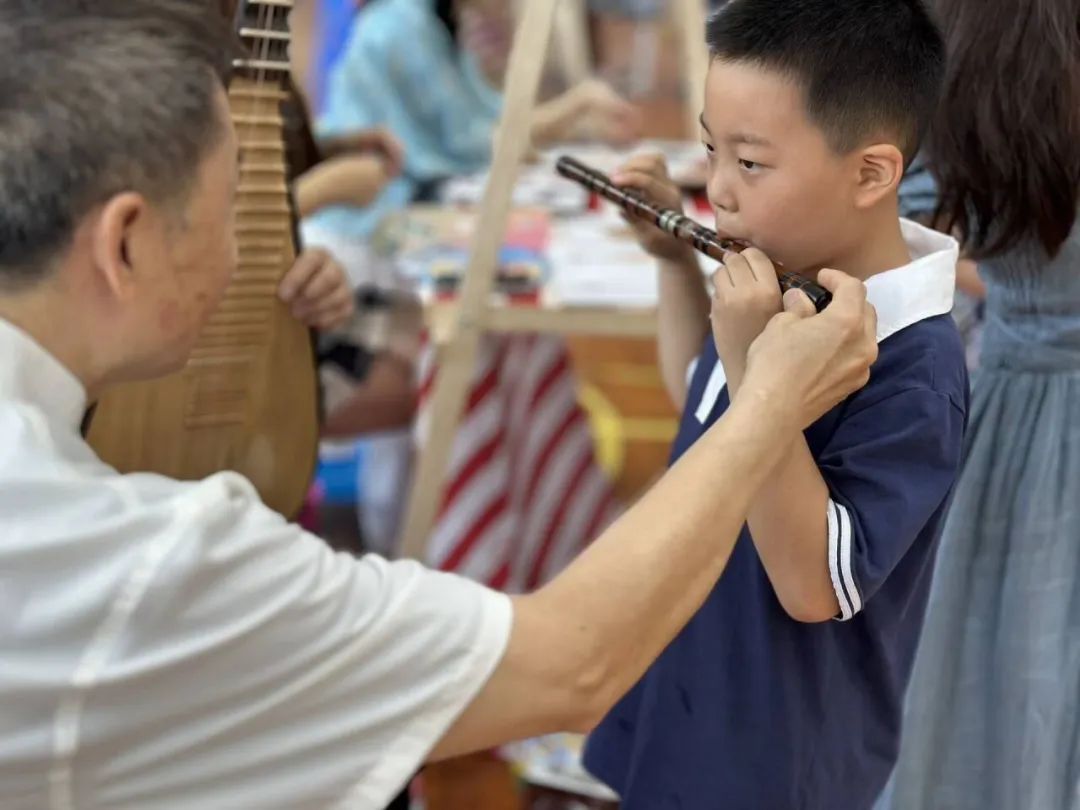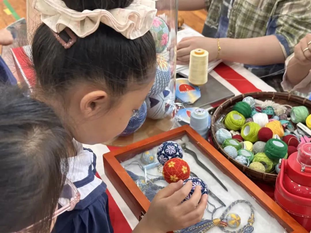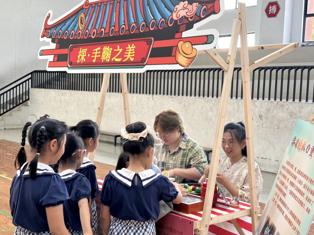 场内设 “探·手鞠之美”“奏·丝竹之声”“赏·沈溇竹编”“承·形意拳韵”“揉・一合酥香” 五大主题体验区。在“赏·沈溇竹编”区,竹编传承人手持细长的竹条,灵巧的手指上下翻飞,一边示范传统编织手法,一边耐心地指导好学的孩子们:“像小鸟叼树枝这样绕过去……”除了学习编织技艺,孩子们还尝试用英语描述自己喜欢的竹编作品。在“奏·丝竹之声”区,学生们随机抽取乐器卡片,不仅要说出乐器名称,还要解答背面隐藏的数学题目。在“承・形意拳韵” 区,小小“武术侠客”们跟随非遗传承人的一招一式,认真体悟形意拳“冲、勇、进”等蕴含的文化精髓。在“揉·一合酥香”区,孩子们化身“小小传承人”,亲手体验“抻拔”“烘烤碾压”“夹馅成型”等传统茶点制作技法,感受指尖上的匠心。