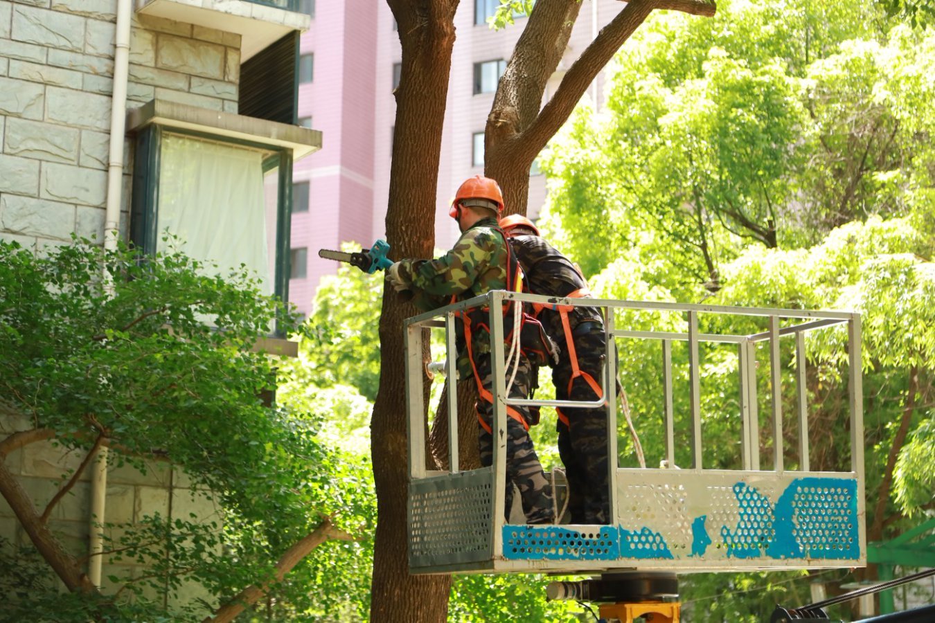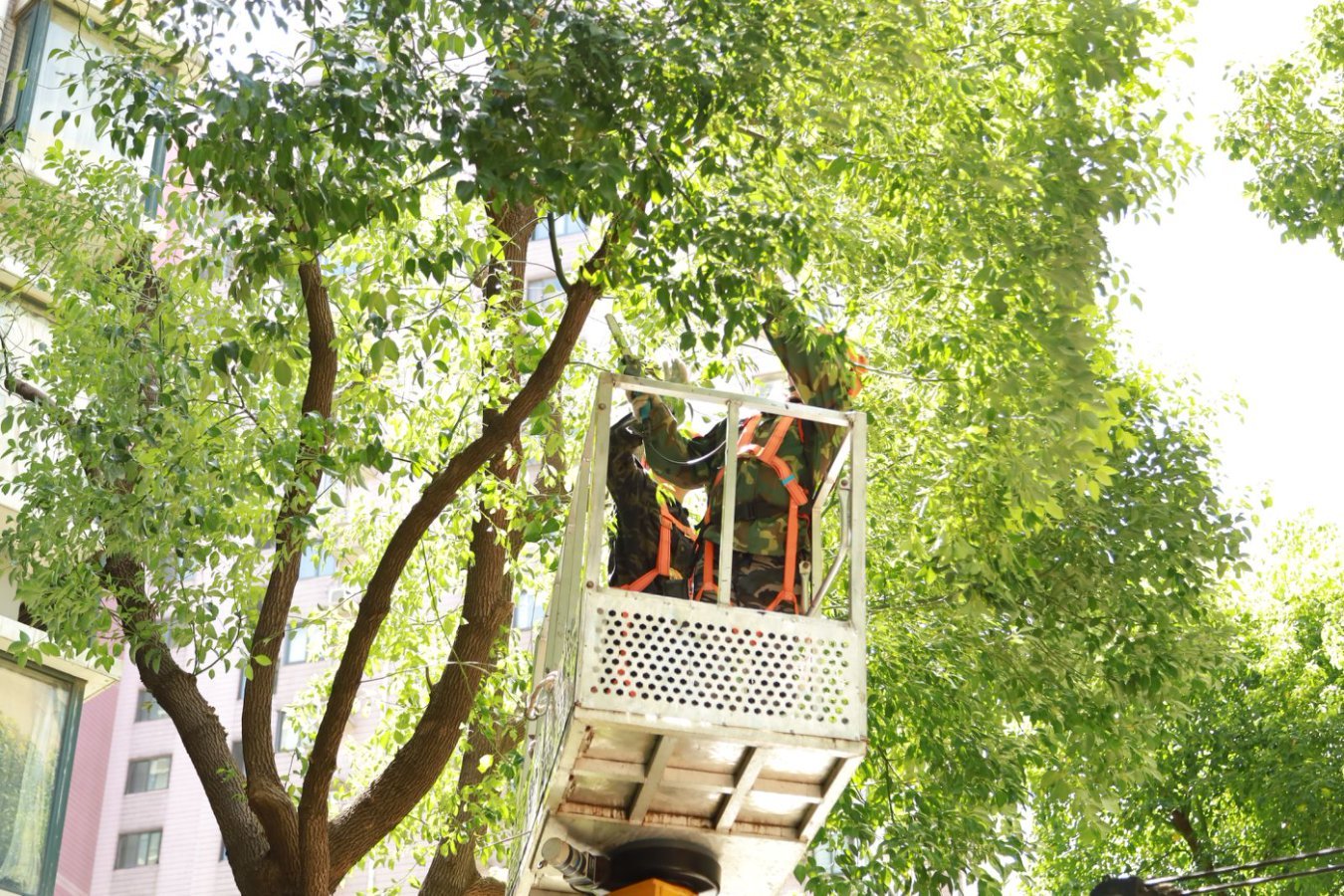 中端专业支撑,把稳技术“方向盘”。联动区绿化管理中心技术力量,制定科学修剪标准(如重修剪保留2/3以上树冠),严控“砍头式修剪”等违规行为。通过资源共享、社区园艺师、党员赋能网格等形式开展结对共建,在小区树木修剪工作遇到困难时,依托社区园艺师及辖区单位静安园林公司专业技术力量,加强现场指导。