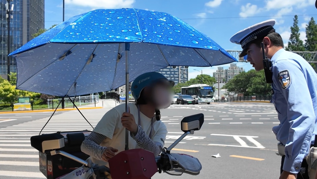 早高峰时段,杨浦交警黄施恒一边做好排堵保畅工作,一边留意来往行人交通违法行为。对于私自加装遮阳伞的车主,黄警官耐心劝导、教育,为他们科普安全知识,并要求车主当场拆除遮阳伞。