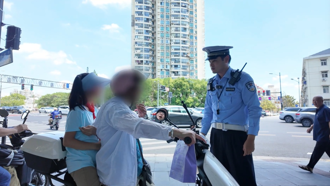 除了遮阳伞,还有个别车主因天热没有佩戴安全头盔。一位家长骑车带娃,却给孩子戴了一顶遮阳帽。虽然遮住了阳光,但也遮住了安全。黄警官当场对家长和孩子进行了安全教育,“骑车人要戴好安全头盔,万一发生交通事故,头盔能够保护生命安全。”