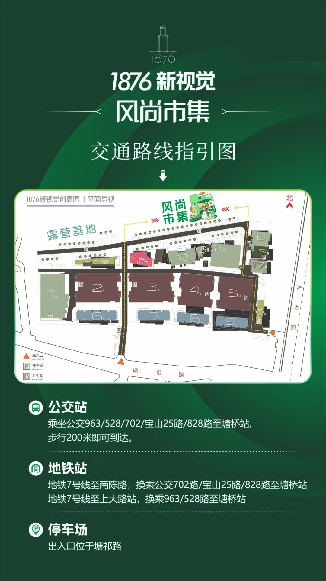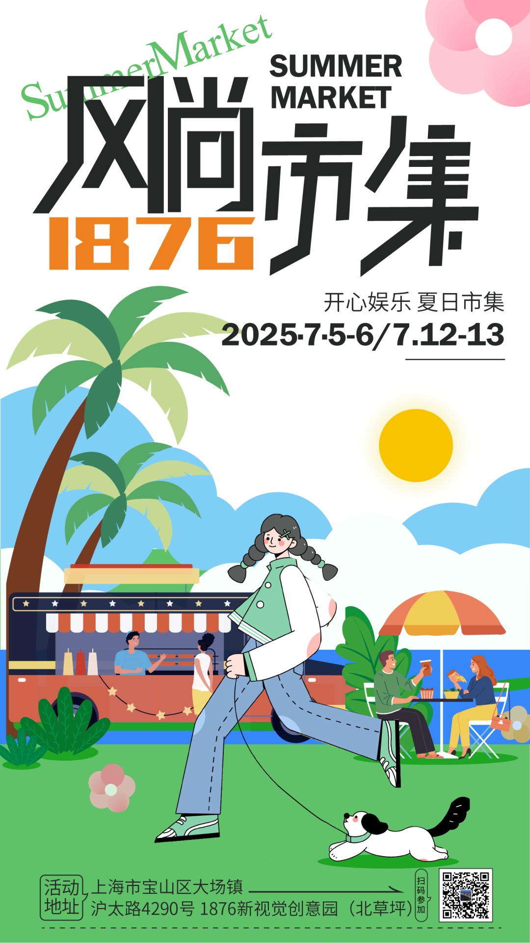 万众期待的1876风尚市集 即将于7月4日晚盛大开幕! 活动包含亲子、萌宠、美食、文创等多类活动 坐标北上海「1876创意园」 在这个高颜值地标 与众多潮流玩家和优质客群相遇 共同打造一场充满活力与创意的夏日盛会! 扫描二维码加入活动群 PART.01 亲子专场-萌娃专属游乐区 大博小馆-亲子非遗课堂 7月5日 第一场:9:30-10:30 布上的小画家-植物拓染 第二场:11:00-12:00 保护海洋小分队-贝壳沙画 报名扫描二维码 全家喜剧桶 7月5日16:30 搞笑漫才 生活段子大改造把大家熟悉的生活场景“神还原”,吐槽上班的疲惫、调侃带娃的趣事……每一个笑点都精准踩中你的“嗨点”,笑到肚子痛! 互动魔术秀 魔术师一出手,神奇戏法接连上演,瞬间点燃全场好奇。小朋友们被邀请上台参与互动,在魔法世界里共享亲子欢乐时刻~ 音乐喜剧 当原创歌曲遇上脑洞大开的剧情,一场视听狂欢就此上演!动感的旋律、魔性的歌词,还有夸张有趣的舞台表演,分分钟让你沉浸其中,忍不住跟着节奏摇摆,全家一起解锁“快乐单曲循环”模式! 报名扫描二维码 PART.02 美食专场-吃喝玩乐不容错过 市集怎能少了美食? 香气四溢的美食区汇聚天南海北的风味与网红小吃!从地道本土小吃到异国风情料理,满足你挑剔的味蕾。边逛边吃,才是市集的正确打开方式,吃货们必冲! 人气爆棚小吃街 天南海北的网红美食、地方特色小吃空降!从滋滋作响的烧烤、清爽甜品,到异国风情的特色料理……多家美味摊位,征服你的味蕾! 精品咖啡&特饮站 夏日限定高颜值饮品、手冲咖啡、创意特调……为逛吃之旅注入清凉活力! PART.03 宠物专区-做一个合格铲屎官 欢迎带上你的毛孩子一起逛市集! 全园区欢迎文明携宠!萌宠社交草坪,让毛孩子们安全社交~ 宠物周边好物 30+特色商户集结!从进口宠粮、手工零食、智能玩具,到定制项圈、潮宠服饰……一站式承包毛孩子的夏日新装! 爱心领养活动 现场开设爱心领养专区,可邂逅待领养的可爱小生命,传递一份温暖关怀,遇见命中注定的它,给流浪天使一个家。 PART.04 创意风暴-沉浸式淘货体验 独立设计师、手作达人集结!原创饰品、匠心家居、艺术潮玩、趣味文创……淘不尽的小众宝藏,激发你的生活灵感!感受年轻原创力量的魅力。 匠人市集 慢慢逛、细细淘,与摊主聊聊创作故事,发现独一无二的生活灵感与小众惊喜! 活动时间 7月5日—6日 16:30-21:00 7月12日—13日 16:30-21:00 活动地址 沪太路4290号 1876新视觉创意园北草坪 了解更多活动 扫描二维码加入活动群