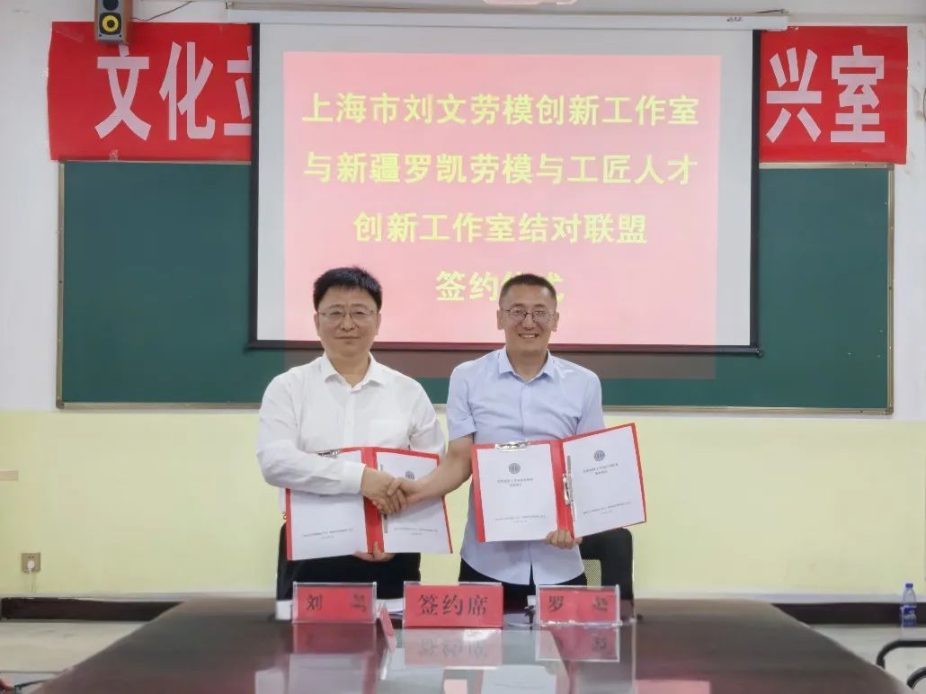6月27日,上海市刘文劳模创新工作室与新疆罗凯劳模与工匠精神创新工作室在巴楚县第二中学正式签约结对,开启“课程思政共创、人才资源共育、教学成果共享”三维合作。此次合作聚焦双向赋能新模式,将依托上海劳模团队的课程研发优势,结合新疆劳模工作室的本地实践,定期组织开展集体备课、联合教研、技术交流等活动,开展“师徒结对”,提高双方成员的教育教学水平和创新能力,联合打造精品学术成果,建立信息共享平台,开展联合调研,组建上海市劳模文化研究中心新疆工作站,共建新时代新疆职工思政教育与创新发展研究中心,实现沪疆两地思政教育优势互补、协同发展。