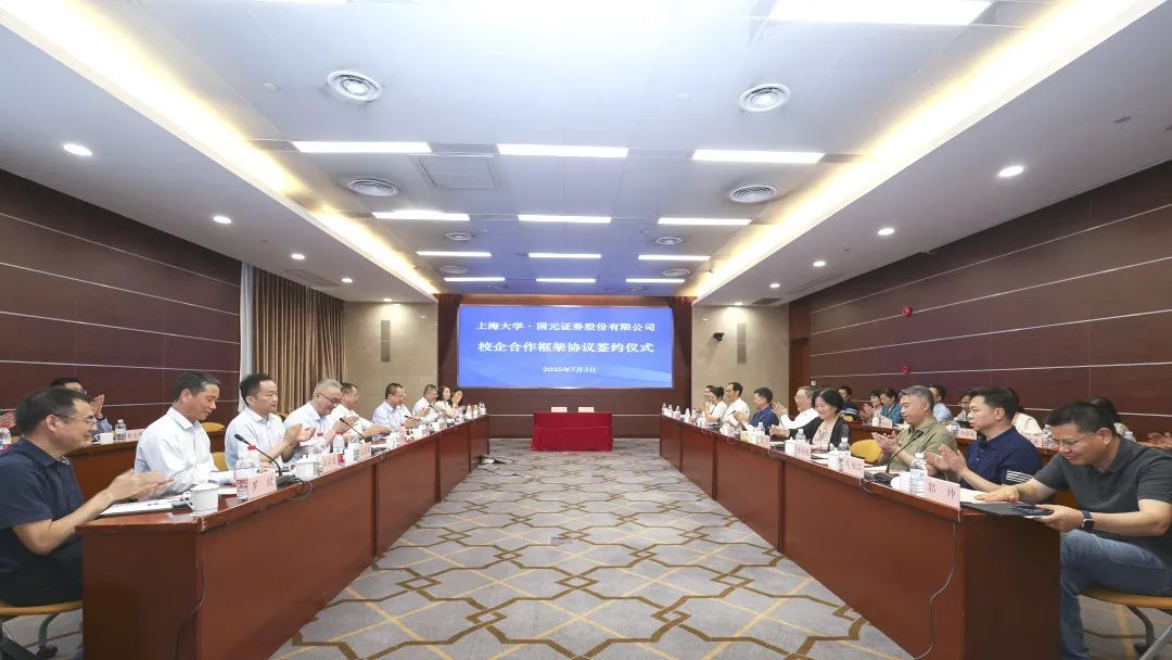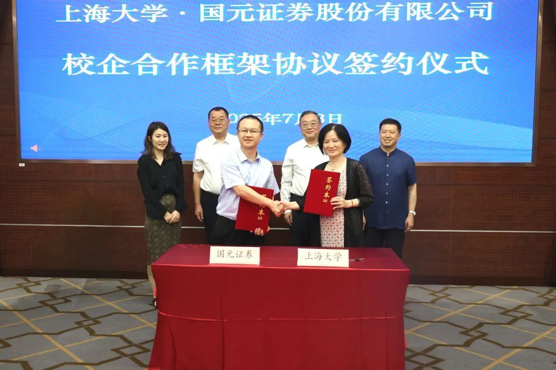 7月3日,上海大学与国元证券股份有限公司校企合作框架协议签约仪式在上海大学宝山校区举行。上海大学党委书记成旦红,党委副书记、校长、中国科学院院士刘昌胜,国元证券股份有限公司党委书记、董事长沈和付,战略客户部上海部总经理唐聿菲见证签约。国元证券股份有限公司执委会委员、副总裁梁化彬,上海大学党委常委、副校长聂清代表双方签约。