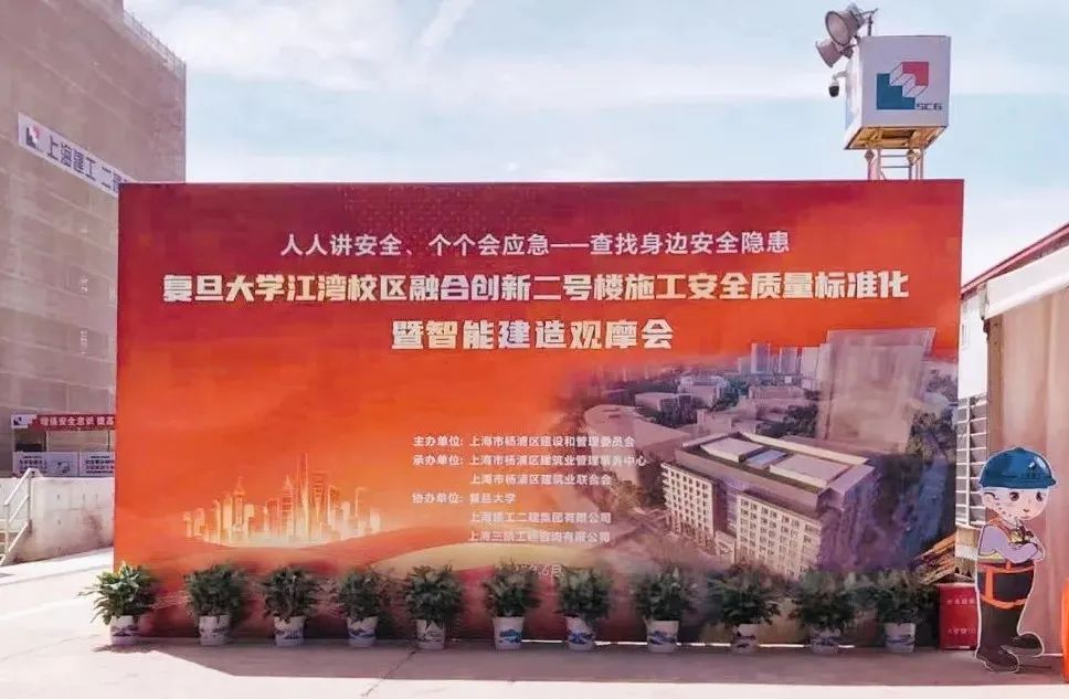 复旦大学江湾校区融合创新二号楼项目位于复旦大学江湾校区内。在施工现场,室外设置了五大功能区域,按颜色进行划分——灰色(临时交底箱)、橙色(工间休息室)、绿色(智能建造舱)、白色(移动卫生间)、红色(应急救援站)。室内则分为安全风险智能监测、安全语音播报警示、防高坠、巡更、BIM技术应用、智能建造机器人、二结构样板、PC、定型化、消防10个展示区。