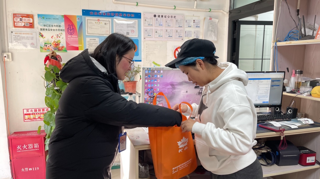 为商户分发宣传折页和平安大礼包(左为王锡莹)