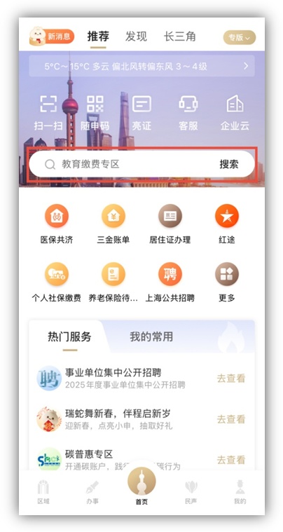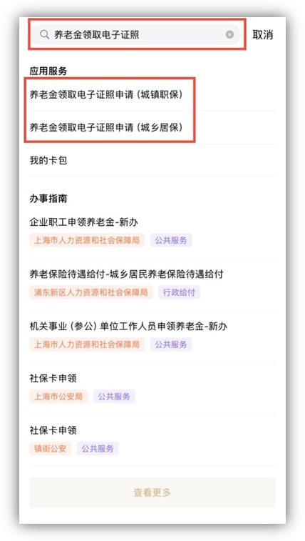 1、登录“随申办市民云”APP,点击搜索栏并输入“养老金领取电子证照申请”查询,选择“养老金领取电子证照申请(城镇职保)”或“养老金领取电子证照申请(城乡居保)”进入“养老金获取电子证照”界面;