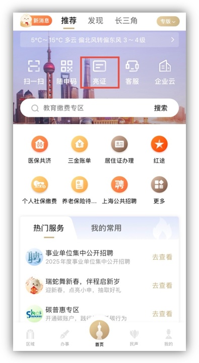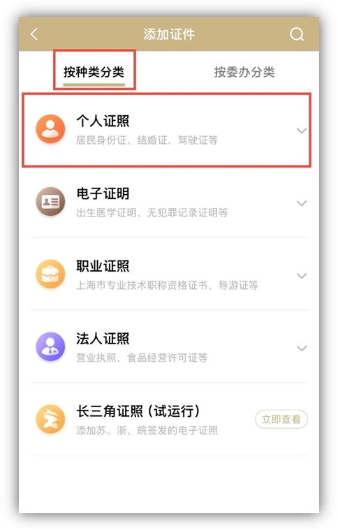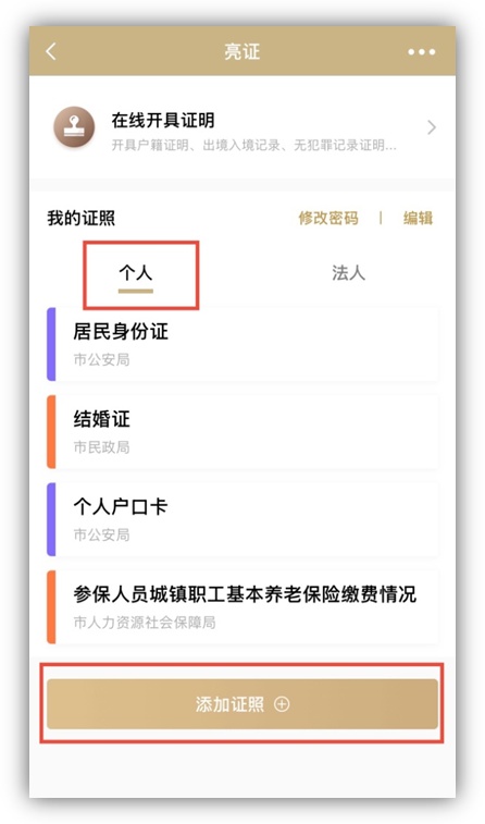 2、在“亮证”界面选择“个人”,点击下方“添加证照”;