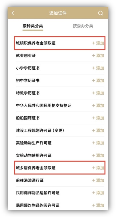 3、点击“个人证照”,查找“城镇职保养老金领取证”或“城乡居保养老金领取证”,点击“添加”即可。