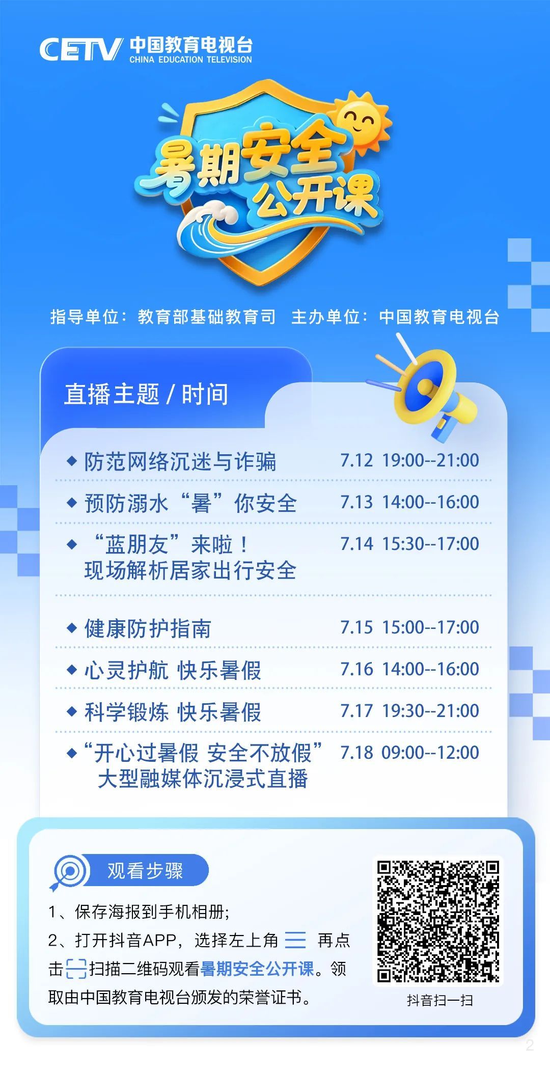 在教育部基础教育司的指导下,中国教育电视台将全面开展暑期安全教育系列宣传,具体安排一起看——