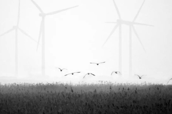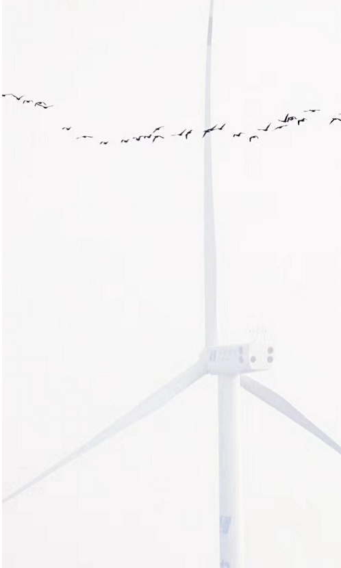 巨大的风车叶片若隐若现,缓缓转动