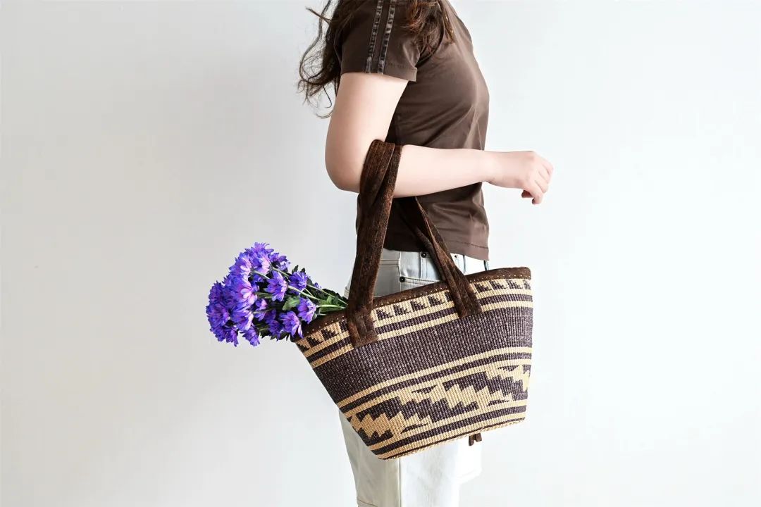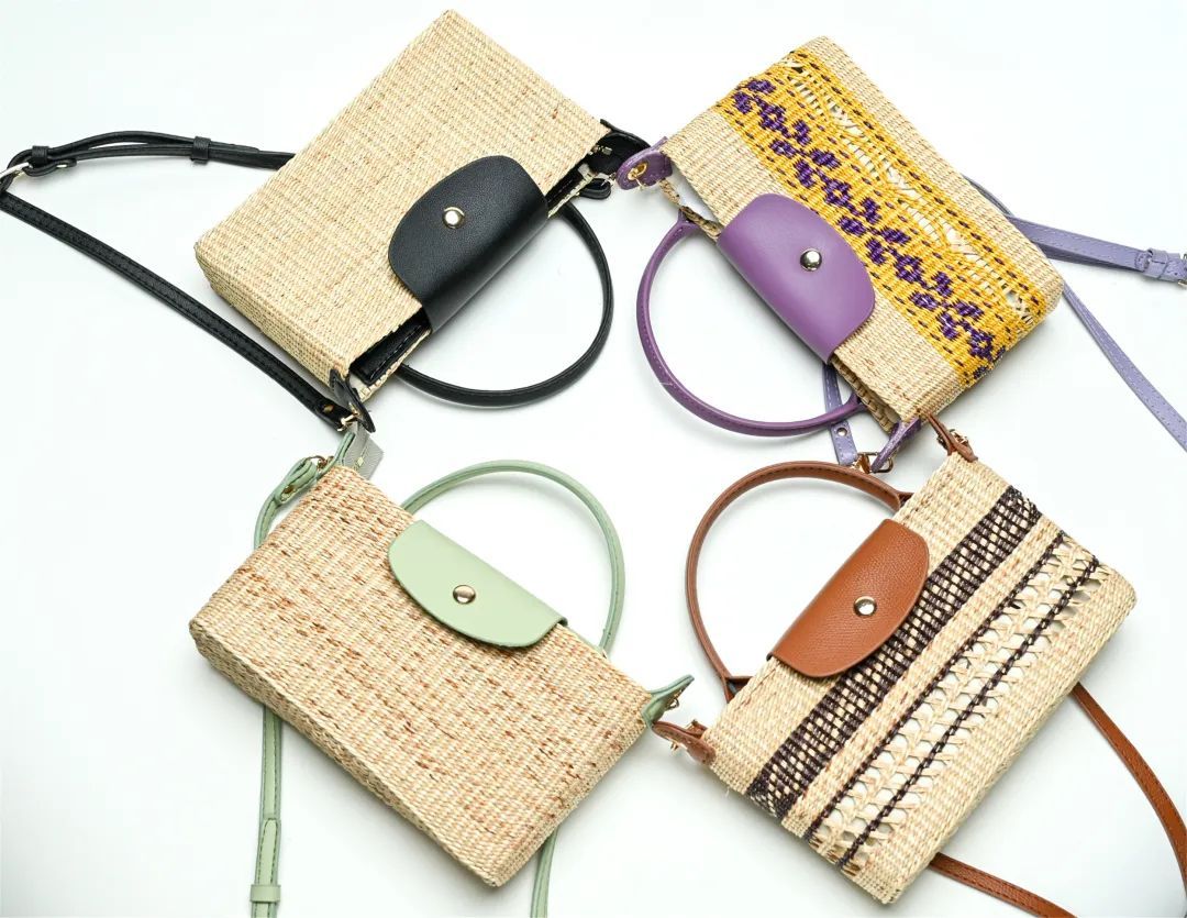 这是一款适合女生出门的斜挎小包,以黄草为包体,简洁小巧,编织有不同的花纹,并配以不同颜色皮质的包扣和挂链。目前有黑、绿、棕、紫4款颜色,未来将推出更多新纹样与颜色,还可以接受私人定制哦!