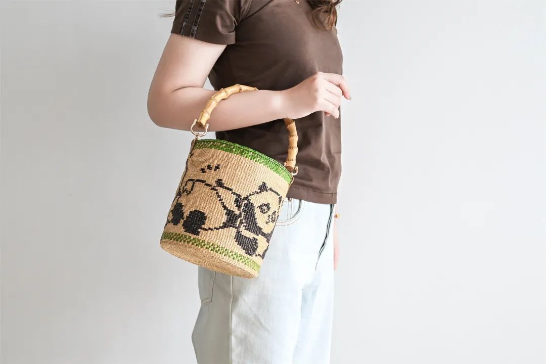 桶包系列多以素色为主,其中一款周身编有熊猫图样的桶包尤为亮眼,它以竹节作为包的手柄,形象且生动。桶包容量不容小觑,还能自由切换手提、斜背、肩背等背法。
