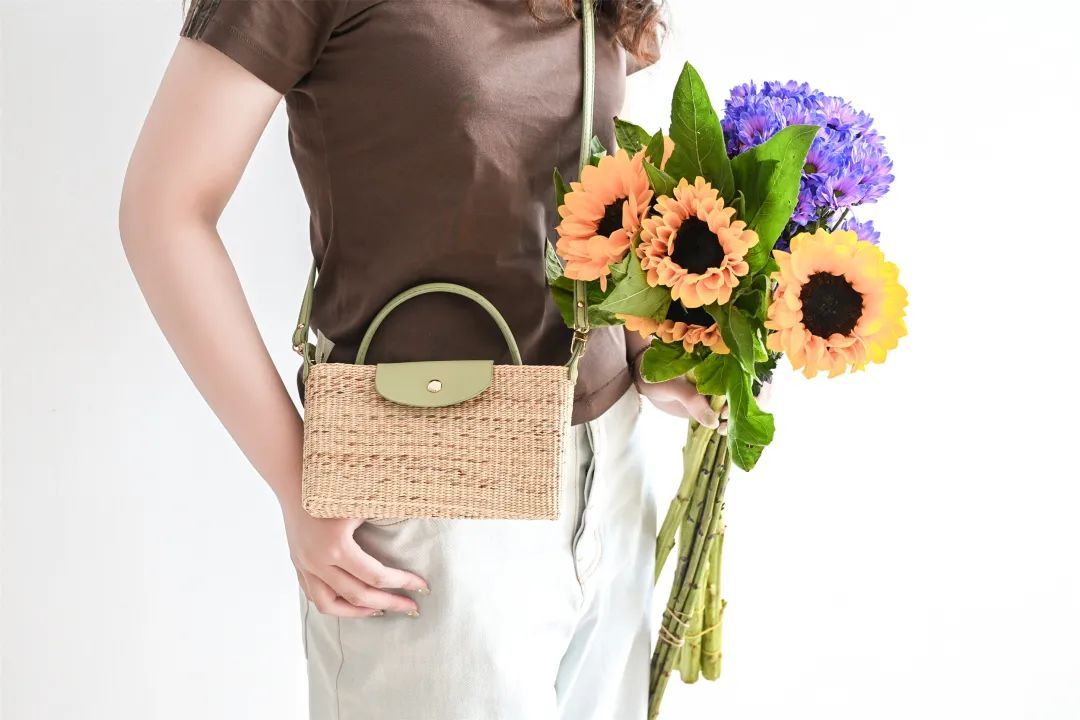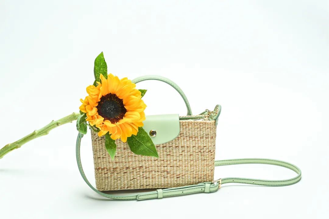 这是一款适合女生出门的斜挎小包,以黄草为包体,简洁小巧,编织有不同的花纹,并配以不同颜色皮质的包扣和挂链。目前有黑、绿、棕、紫4款颜色,未来将推出更多新纹样与颜色,还可以接受私人定制哦!